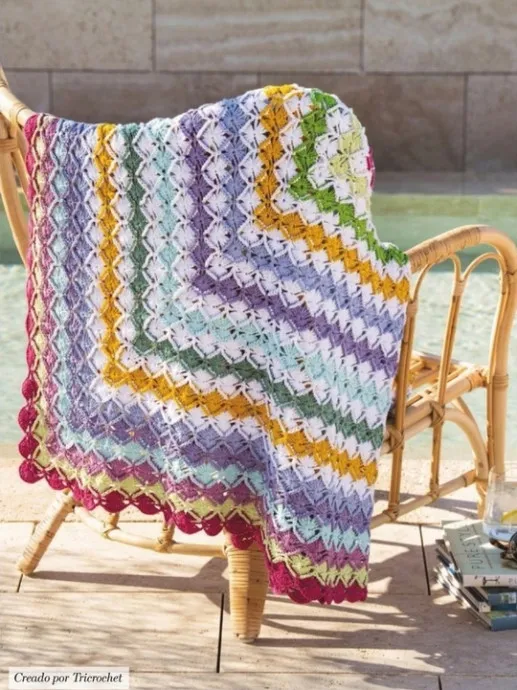 - Зигзаги и волны. Узор зигзаг или волна добавит динамики пледу. Смена цветов в каждом сегменте сделает плед еще более ярким и интересным.