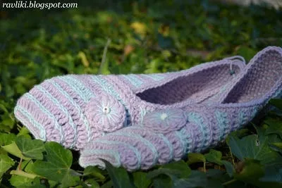 По краю тапочки обвязываем столбиками без накида, но в процессе вязания я прокладывала дополнительную ниточку. Оба ее хвостика выведены назад, на пятку, поэтому их можно тянуть и завязывать бантиком.