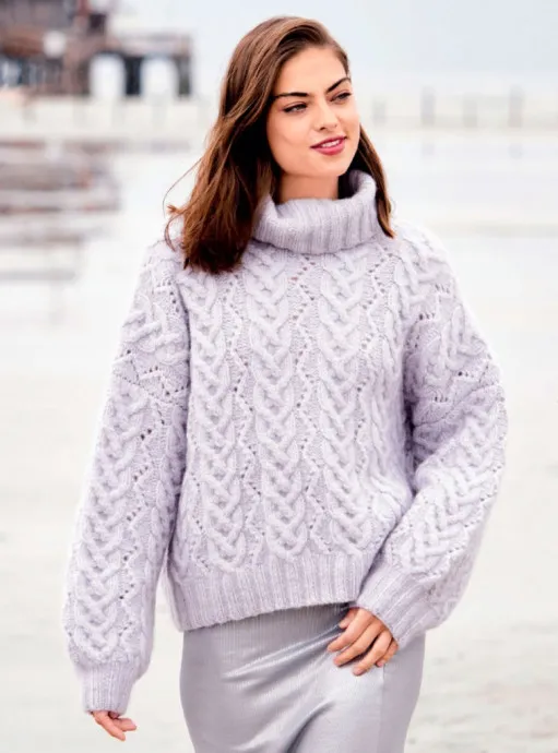 Невероятно мягкий и уютный свитер оверсайз, связанный из шерсти мериноса и кашемира. Он богато декорирован широкими «косами», напоминающими араны. Широкий воротник гольф, нижняя планка и манжеты выполнены резинкой.