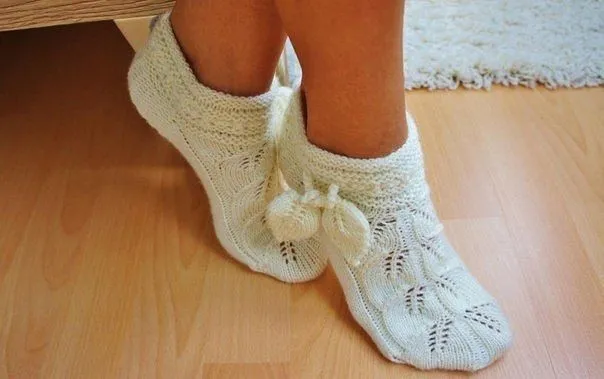 Далее вяжем на 2-х спицах (24 петли) лицевые петли, а на двух (24 петли) — узор (это верх тапочка).