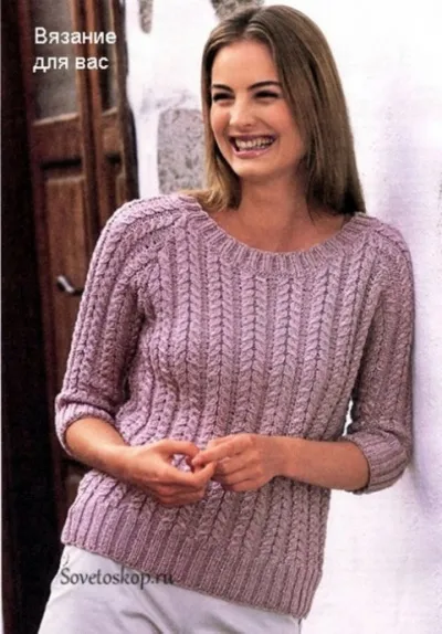 выполнить швы реглана, боковые швы и швы рукавов. На круглые спицы набрать по вырезу горловины 132 (136) 140 п. и связать 3 см резинкой. Петли закрыть.