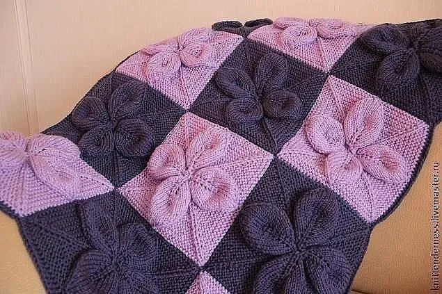 2 вместе лиц. с наклоном влево: снять 1 п., провязать след. п. лицевой, накинуть снятую петлю на провязанную.Плед связан на 4-х спицах в две нитки. Квадраты вяжутся отдельно, от центра каждый, затем соединяются крючком. Набрать 8 п. и распределить их на 4 спицы. Описание дано только для одной спицы, следовательно, каждый ряд описания нужно повторить 4 раза. С 17-го ряда начинается убавление петель по краю листика. Всего вяжем 12 квадратов. Общий размер пледа в итоге получается 85*65см. После соединения крючком всех квадратов обвязываем по краю плед крючком(столбик с накидом).
