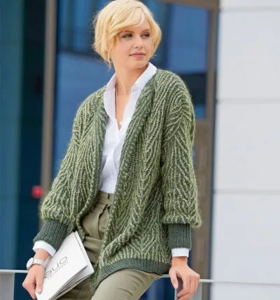 пряжа (30% мохера, 30% хлопка, 25% полиамида, 15% шерсти; 250 м/50 г) — 150 г серо-зеленой; спицы №4; круговые спицы №5.