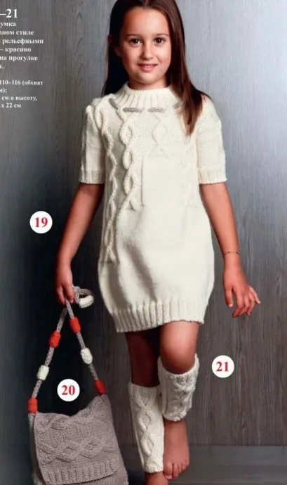 Вам потребуется: пряжа Mondial Prima (100% шерсти; 95 м/50 г) – 350 г кремовой (Т 426) и остатки серой (№ 300) для платья; 100 г кремовой (№ 426) для гетр; 150 г серой, остатки кремовой и красной для сумки; спицы № 4,5 и 5; вспомогательная спица.