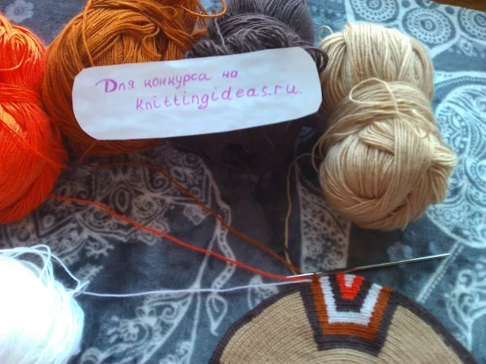 След ряд: снова делаем прибавки в бежевом, а в цветном прибавляем цвет: 3 какао, 3 терракота, 3 белая, какао, 3 белая, 3 терракота, 3 какао. Вяжем до конца ряда.