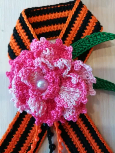 очень красиво.вы молодчина.ни когда бы не додумалась связать георгиевскую ленточку, классно вышло, да еще гвоздичка.Гвоздики вязала, только большие на стебле, подарила подруге, она была в восторге.Удачи вам и солнечной погоды на параде.