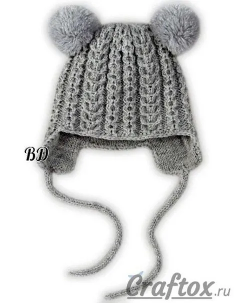Начинала с ушек. Для первого ушка набрала 22 петли, провязав по схеме 12 рядов, оставила ушко на спице, второе связала аналогично. Далее петли распределила следующим образом: петли ушка + набрала 22 петли затылка + петли второго ушка + 44 петли для лба. Все полученные петли сомкнула в кольцо и вязала по кругу по схеме.
