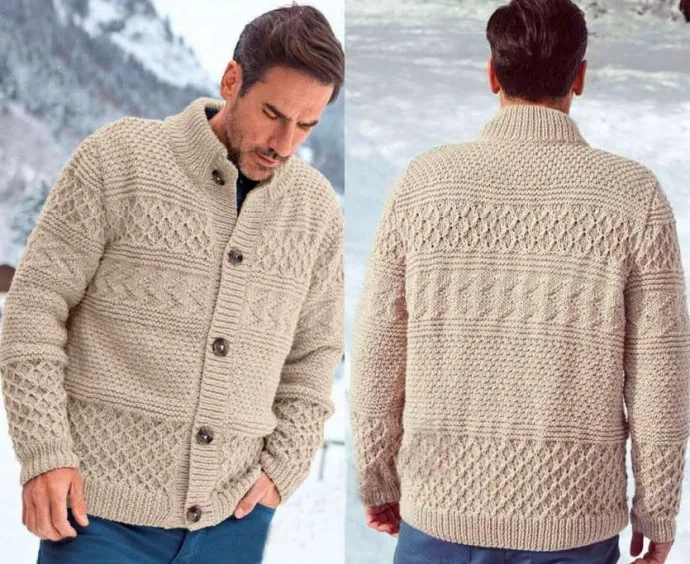 Далее вязаный мужской кардиган выполняем платочным рис-м, делая 8р. В первом из них убавляем с равным интервалом 11; 14; 14; 16п. У нас 37; 39; 43; 45п. Продолжаем 24; 26; 28; 28р. фантазийным уз. Потом опять 8р. платочного рис-ка, в последнем р. которого делаем прибавку 1п. для р-ров М и XL. У нас 37; 40; 43; 46п.