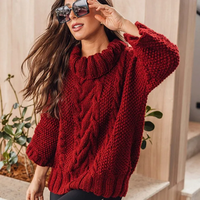 Объёмный красный свитер, украшенный крупными косами и рисовой путанкой. Большой воротник-хомут и широкие рукава ниже локтя довершают стильный образ.