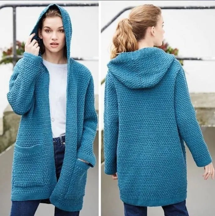 Стачиваем плечи, швы на рукавах и боках. Вшиваем рукава.Капюшон По лицевой стороне кр. № 4,5 вывязываем по краю горловины 103 – 109 – 109 – 115 СБН с равномерным распределением. При этом начало и конец ряда должны совпадать с краями планок.Поворачиваем работу, выполнив 2 ВП. Сделаем вязание в обратную сторону, делая по 1 ССН в каждую птл.Продолжаем узором решётка, не забирая в работу крайние 8 птл с двух сторон. На этих птл вяжем планку капюшона.При длине детали 27 – 28 – 29 – 30 см центральные 27 – 29 – 29 – 31 птл оставляем без провязывания. Боковые стороны довязываем отдельно.При длине боковых элементов, равных длине центральной детали на участке непровязанных птл, завершаем работу.Выполняем на капюшоне швы по центру. Пришиваем центральную часть к участку с непровязанными птл сзади капюшона.Карманы