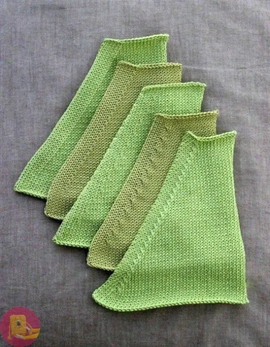 3. Начинайте ряд с 5 лицевых, затем 2 вместе лицевыми, в конце — протяжка. Провяжите следующий ряд без убавлений. В следующем ряду в начале — протяжка, а в конце — последние 2 петли вместе лицевыми. Повторяйте от * до *.