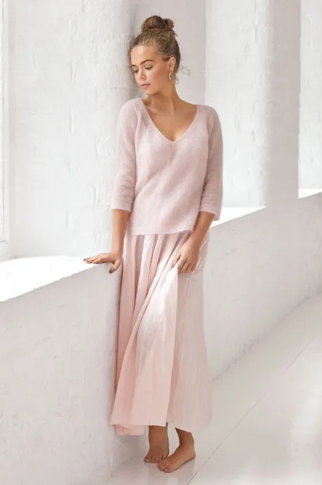 Ким Харгривз плотно сотрудничает с компанией Рован, поэтому и пряжа предложена Rowan Kidsilk Haze (70% супер кид мохер, 30% шелк, длиной 210 метров в мотках весом по 25 граммов), которой потребуется всего лишь 4 (5, 5, 5, 6, 6) мотка по 25 граммов бледно-розового цвета Grace.