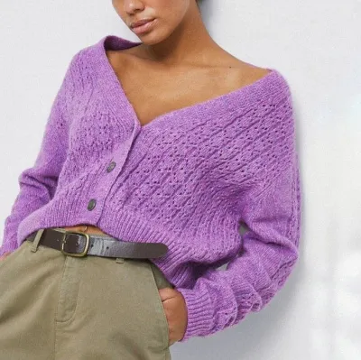 Модель представляет собой укороченный кардиган свободной посадки с втачными рукавами и V-вырезом горловины.