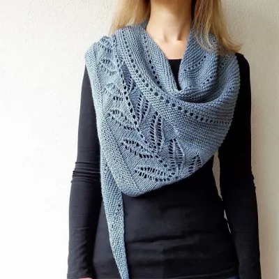 Треугольная шаль вяжется спицами поперек, с диагональной гладью и вогнутым верхним краем, чтобы красиво лечь вокруг шеи. В элегантной шали скомбинирована платочная вязка с дырочками и красивый ажурный узор с листьями.