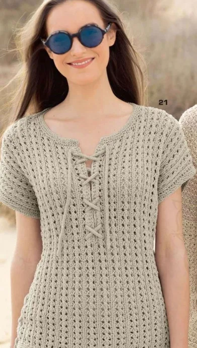 в боковые разрезы переда и спинки крест-накрест в 1-е отверстие узора 2 и завязать у нижнего конца. Третий шнур аналогично вдеть снизу вверх крест-накрест в разрез горловины и оставить свободные концы шнура.