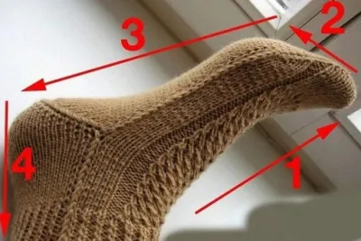Носки начинаем вязать с части «а». Набираем нужное кол-во петель – половина от объема щиколотки и вывяжем резинку. Ее высоту для себя определяйте сами, в среднем это 8-10 см. После этого переходим на чулочную вязку. Если вы хотите вывязать не просто теплые, но и очень красивые носочки, тогда подберите для этого участка работы любой понравившийся узор. Главное, чтобы он пропорционально лег на нужные вам размеры.