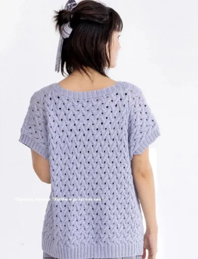 Сборка. Сшить плечевые швы. набрать по краю горловины 53 + 53 + 66 п. Вязать резинкой. По центру передней части провязывать по 2 п вместе два раза. Резинка = 2,5 см. По краю проймы рукава набрать 118 п. Провязать резинкой 2 х 2 = 2,5 см. Сшить боковые швы.