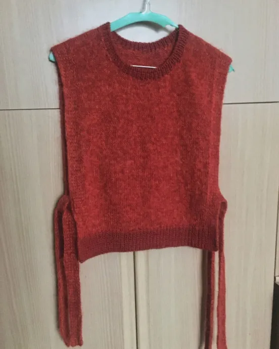 По краям связана цельновязная планка, основной узор - лицевая гладь.Ширина жилета 38 см, длина - 49 см. Ширина планок 3 см, высота резинки 6 см. Завязки вывязаны на высоте 11 см от начала вязания. Длина завязок 40 см.
