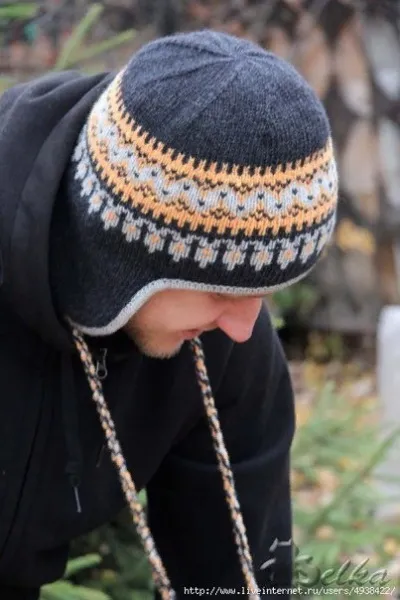Обвяжите нижний край шапки крючком свободными столбиками б/н 1 рядом черной нитью и 1 рядом серой нитью. Скрутите 2 шнурка из нитей разного цвета длиной 26 см и пришейте к уголкам «ушек» (см. фото).