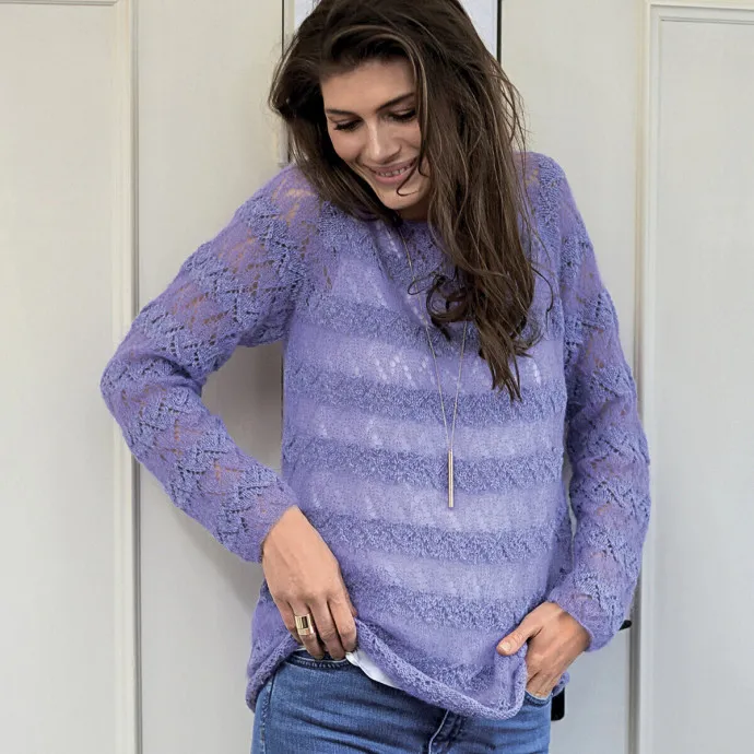 Для вязания нам потребуется — на размеры S (M) L (XL) XXL соответственно — пряжа 1 (100% шерсть; 50 гр — 225 м) — 3 (3) 4 (5) 6 мотков цвета лаванды; пряжа 2 (70% мохер, 30% полиамид; 25 гр — 225 м) — 2 (3) 3 (3) 4 мотка светло-лиловой. Спицы № 3,5 и 4, а также круговые спицы № 2,5 и 3 длиной 40 см; круговые спицы № 3,5 и 4 длиной 40, 60 и 80 см и крючок № 2,5.