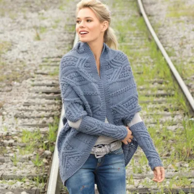 Пряжа (100% натуральной шерсти; 90 м/50 г) — для жакета 650 г, для митенок 100 г голубой; для жакета круговые спицы №5; для митенок 1 комплект чулочных спиц №5.