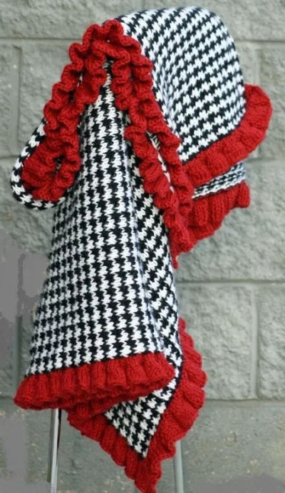 Вязанный крючком плед в узоре «гусиная лапка» — это классика, которая всегда выглядит дорого и стильно. Чёрно-белое сочетание подчёркивает графичность узора, а кайма насыщенного красного цвета добавляет яркий акцент и превращает вещь в интерьерный арт-объект.