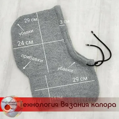 Ширина воротника 29 см (1/2), капюшона 24 (1/2)+3 см кулиска. Высота воротника 14 см, капюшона 29 см. Фото и описание.