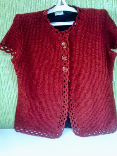 Получилась вишнёвая кофточка к лету. Вязала спицами, отделка крючком. Нитки «Агата льняная для ручного вязания» в 100 г — 380 м. Израсходовала 400 г, спицы №2.