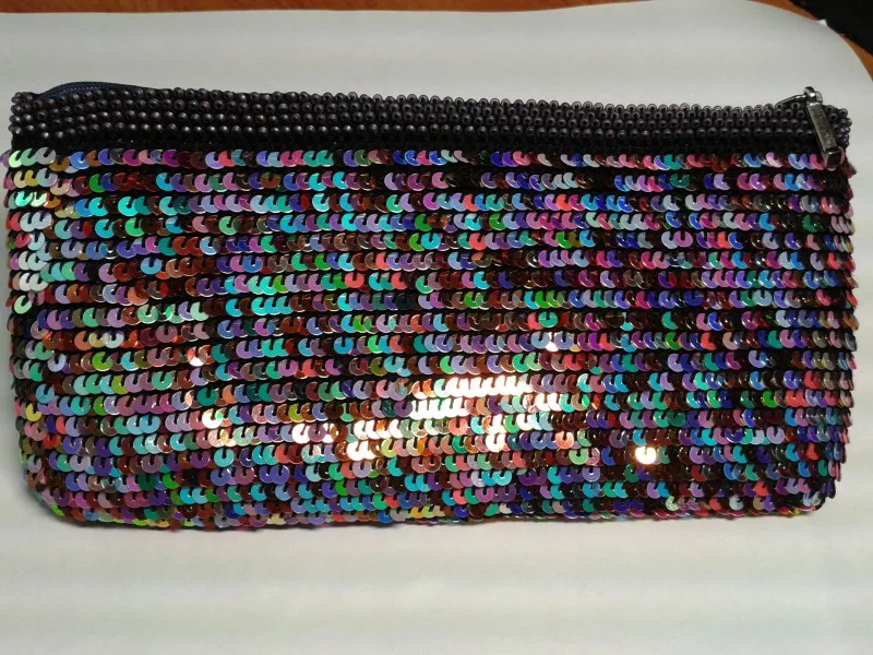Для начала нам необходимо сделать немного нудную работу, а именно - нанизать все пайетки на пряжу. Приступаем к изделию! Вяжем цепочку из воздушных петель, затем по- кругу обвязываем столбиками без накида, не забывам делать прибавки по 3 петли на "крутых поворотах". Это был первый ряд. Теперь добавляем в работу пайетки. Вытягиваем петельку, пододвигаем пайетку вплотную к вязке, закрываем петельку. Это совсем не сложно! Провязываем один ряд. Затем ряд без пайеткок и т.д., чередуем. Вяжем необходимую высоту косметички. Верх можно закончить просто полотном из пряжи, а можно добавить бисер. Для этого ниточку обрезаем, набираем на нее бисер (используем бисерную иглу и тонкую леску) 20-25 см. Бисер добавляем в вязку также, как пайетки.