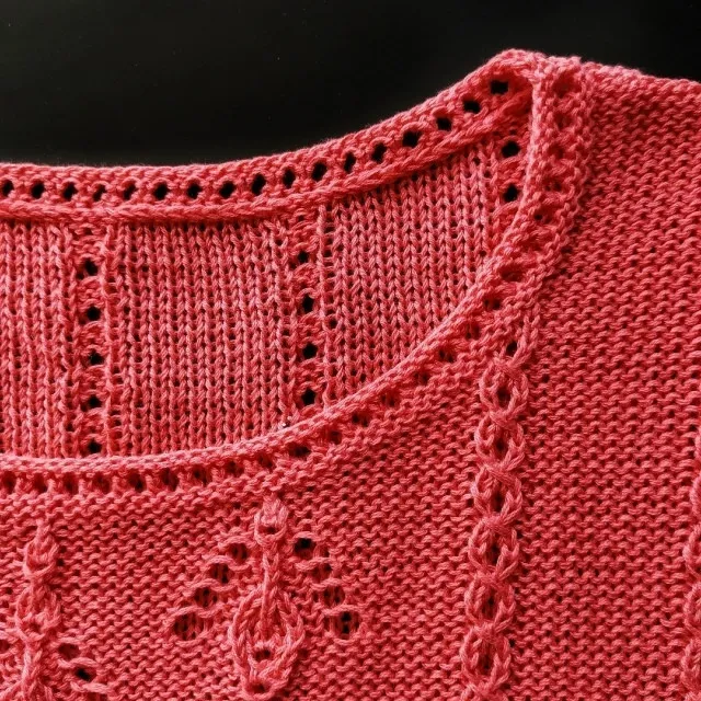 Как мне нравится такая обвязка горловины. Один ряд с дырочками – просто и изящно. Как раз для ажурных летних вещей. Изделие, связанное простой лицевой гладью такая планка тоже украсит.