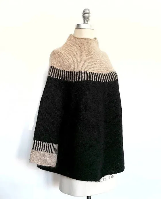 Интересный свитер-пончо Cedar Point от дизайнера Espace Tricot вяжется сверху вниз по кругу.
