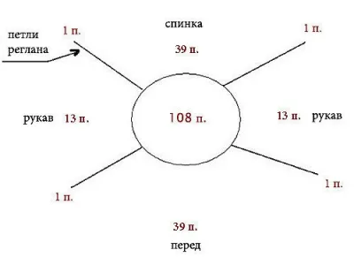 В итоге получилось : 26 петель спинка, по 9 петель рукава, 27 петель перед и по 2 петли четыре регланные линии.Для удобства наносим эти расчеты на схему: