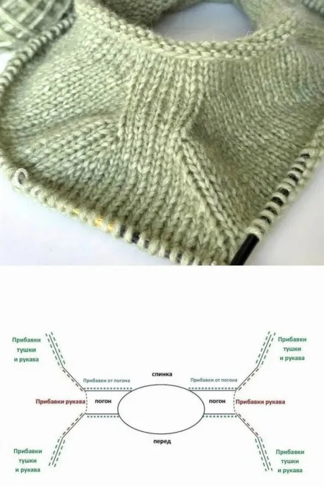 Общий принцип вывязывания реглана-погона отличается от реглана сверху.