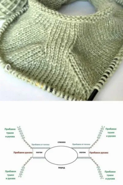 Сходство лишь в том, что нужная ширина тушки и рукава достигается путем прибавления петель в ходе вязания кокетки изделия