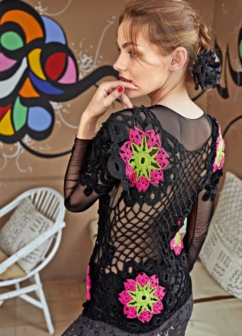 Затем вязаные детали снять с подложки, по боковым сторонам и на плечах соединить также перекрещивающимися цепочками из в.п., оставив верхние участки по боковым сторонам длиной по 23 см для пройм открытыми. В процессе работы изделие для контроля периодически прикладывать к выкройке.