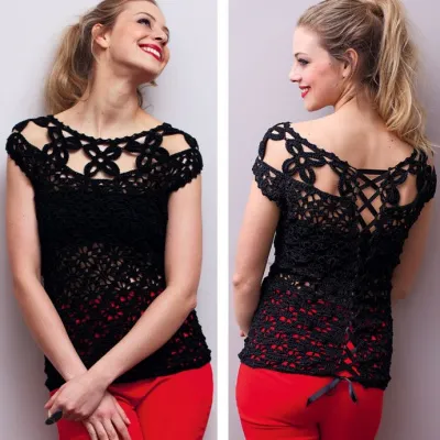 Горловину и плечи этого топа окаймляет изящная цветочная гирлянда, а сзади — шнуровка! Если же вы предпочитаете более сдержанный стиль, перед и спинку можно выполнить идентично.