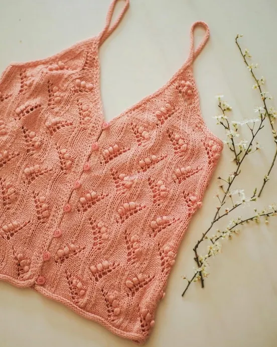Персиковый цвет — это тепло, мягкость и лёгкое сияние лета. Топ, связанный спицами в таком оттенке, выглядит особенно деликатно: он освежает образ, подчёркивает загар и добавляет нотку романтики