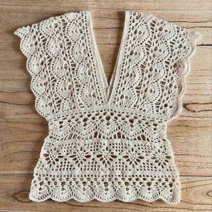 Натуральный оттенок подчёркивает загар, а ажурная фактура добавляет воздушности и изящества. Такой топ легко становится базой летнего гардероба — его хочется носить снова и снова.