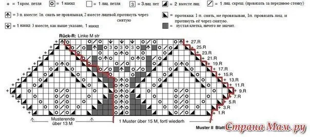 17 ряд - *протяжка, 2лиц., накид, протяжка, 1лиц., 2вм. лиц., накид, 2лиц., 2вм. лиц., накид, 1лиц. скрещ., накид, 3вм. лиц., накид, 1лиц. скрещ., накид*