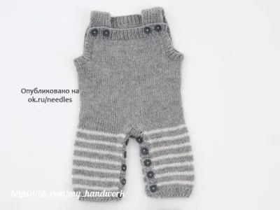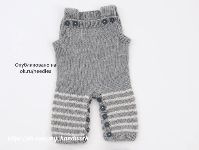 По краю шаговых швов задней части комбинезона круговыми спицами набрать 80 (88) 96 п. нитью серого цвета и вязать 1,5 см резинкой. Петли закрыть.