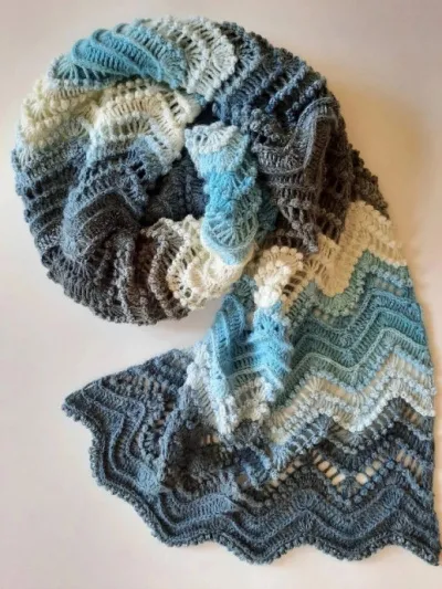 Этот палантин, связанный крючком, словно вдохновлён небом и лёгкой дымкой. Переливы голубого, белого и серого создают мягкий градиент, который выглядит благородно и очень гармонично.