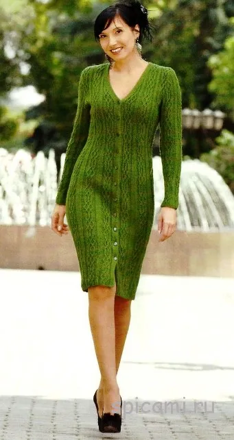 Левая полочка. Набрать 56 п. Петли распределить следующим образом: 1 кром. п., 1 лиц. п., * 14 п. рельефного узора, 2 лиц. п. *, повторить от * до * 1 раз, 14 п. рельефного узора, 7 лиц. п. - планка, 1 кром. п. и вязать по рисунку. Для расширения полотна в 13-м ряду от начала работы равномерно выполнить прибавки по лиц. п. 1 раз 1 п., затем в каждом 16-м ряду 2 раза по 1 п., в каждом 14-м ряду 3 раза по 2 п. На спицах = 65 п. (1 кром. п., 4 лиц. п., * 14 п. рельефного узора, 5 лиц. п. *, повторить от * до * 1 раз, 14 п. рельефного узора, 7 лиц. п. - планка, 1 кром. п.). С 89-го ряда от начала работы вязать прямо. Для оформления линии бедер в 145-м ряду от начала работы равномерно убавить 1 изн. п., затем равномерно убавить в каждом 8-м ряду 2 раза по 1 лиц. п., в каждом 6-м ряду 2 раза по 1 лиц. п., 2 раза по 2 лиц. п., затем равномерно убавить в каждом 6-м ряду 1 раз по 3 изн. п. На спицах = 53 п. (1 кром. п., 2 лиц. п., * 13 п. рельефного узора, 2 лиц. п. *, повторить от * до * 1 раз, 12 п. рельефного узора, 7 лиц. п. - планка, 1 кром. п.). Для оформления линии бока в 199-м ряду от начала работы равномерно выполнить прибавки по изн. п. (включая их в рельефный узор) 1 раз 1 п., затем в каждом 6-м ряду 1 раз 1 п., затем равномерно выполнить прибавки по лиц. п. в каждом 6-м ряду 7 раз по 1 п. На спицах = 62 п. (1 кром. п., 9 лиц. п., * 14 п. рельефного узора, 2 лиц. п. *, повторить от * до * 1 раз, 12 п. рельефного узора, 7 лиц. п. - планка, 1 кром. п.). Для оформления линий пройм в 253-м р. от начала работы закрыть с правой стороны 4 п., затем в каждом 2-м ряду 1 раз 3 п., 1 раз 2 п., 2 раза по 1 п. На спицах = 51 п. Для оформления выреза горловины в 245-м ряду от начала работы закрыть с левой стороны 1 п., затем * в каждом 4-м ряду 1 раз по 1 п., в каждом 2-м ряду 1 раз по 1 п., в каждом 4-м ряду 1 раз по 1 п. *, повторить от * до * 5 раз, в каждом 2-м ряду 1 раз 1 п. На спицах = 31 п. В 67-м ряду от начала линий пройм все петли закрыть в одном ряду.