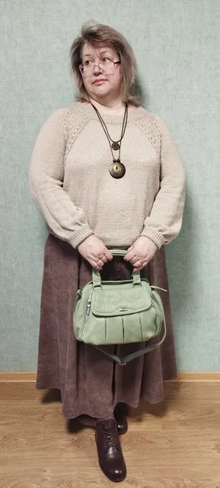 Очень понравился Ваш джемпер! Наировнейшая лицевая гладь, великолепная посадка на модели, шикарный узор, красивая отделка горловина, изумительный реглан!