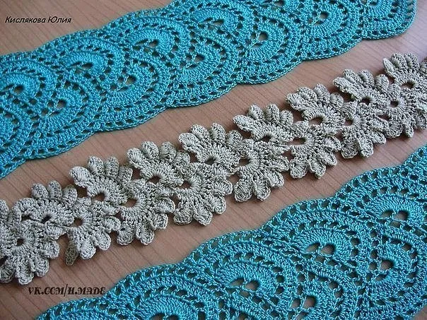 Ленточное кружево вяжется в виде ленты, длина которой зависит от длины изделия, а ширина - от узора и толщины нитей. Затем их скрепляют между собой.