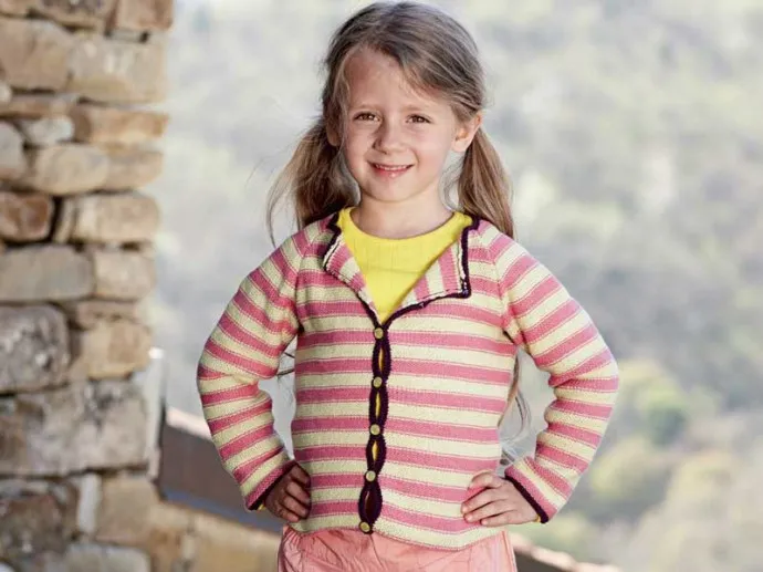 Такую кофточку можно связать из хлопка, тонкой шерсти или смесовой пряжи. В исполнении она довольно проста – модель связана изнаночной гладью из пряжи двух цветов.
