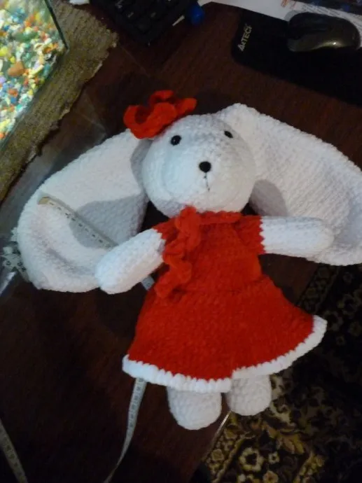 Зайка высотой около 30 см, мягкая, на ощупь как плюшевая. связана крючком. Отличный подарок на любой повод.