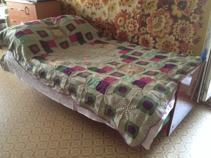 Сейчас уже не скажу. Тем более основная часть — это остатки от других работ. Помню только, что на дочкин плед покупала 10 мотков бежевой Каролины, а осталось только 3. Но там и другого цвета много плюс в квадратах пышные столбики. Если сильно интересует могу попробовать только взвесить плед, моточки были все 100 граммовые, легко высчитать будет.