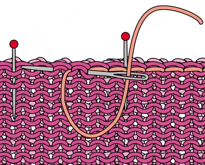 1. Сначала отметить середину рукава. Рукав зафиксировать булавкой по краям переда и спинки, середина рукава должна совпадать с плечевым швом, который был выполнен швом «петля в петлю». При этом на рукаве захватывать по 1 петле, лежащей ниже закрытого края, а на переде и спинке захватывать по две протяжки между кромочной и первой петлей. Так как петли и ряды имеют разную ширину, периодически нужно захватывать только одну протяжку.