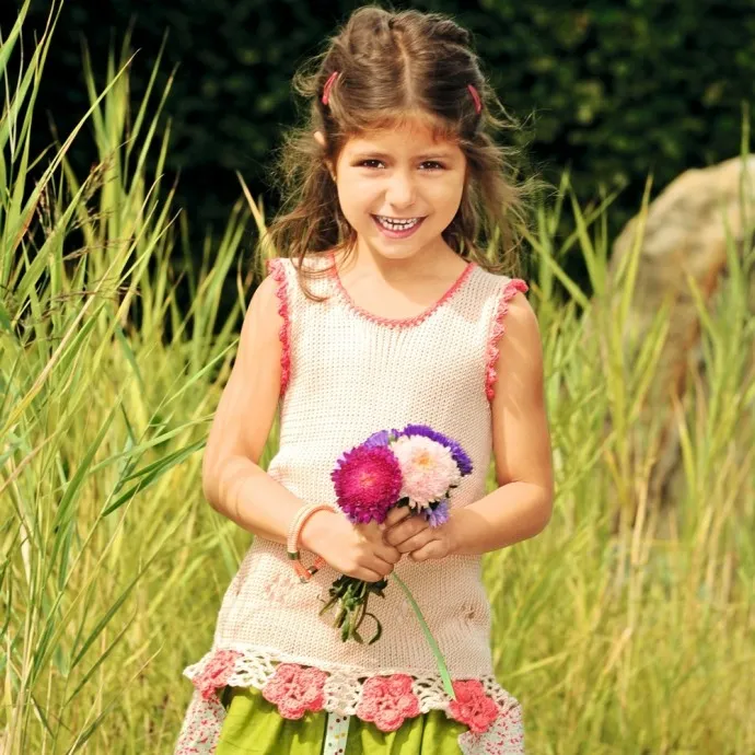 Нежный топ, связанный на спицах, дополнен кружевным цветочным бордюром, выполненным крючком.