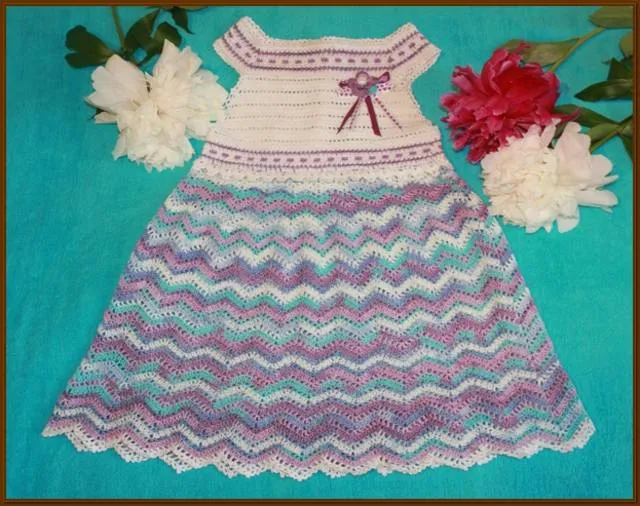 Фоткала на скорую руку, т. к. за ним уже приехали и внизу ждала машина, так что получилось не очень...Схему юбочки прилагаю.Полоски с сиреневыми прямоугольничками вязаласпособом крючкового жаккарда,переход отлифа к юбочке урасила вязанной каймой ,схемку тоже даю.Украсила съемным цветочком ,схемку тоже прилагаю.